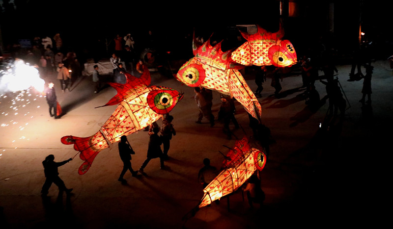 夜幕降臨,伴隨著鏗鏘的鼓點和絢麗的煙花,氣勢宏大的嬉魚燈隊伍開始沿村莊巡遊,每條魚燈由七八個壯漢抬著向前遊行,或慢步移走,或急速前進,或豪放奔跑。嬉魚燈隊伍沿著規劃好的路線鑽胡同、走巷弄,村莊的街頭巷尾,摩肩接踵,家家戶戶門口都自發燃放鞭炮,預祝新的一年一帆風順、五穀豐登,整個小村都與喜氣洋洋的魚燈們交融著,呈現一幅生動逼真的“百魚嬉水圖”,場面熱鬧而壯觀。