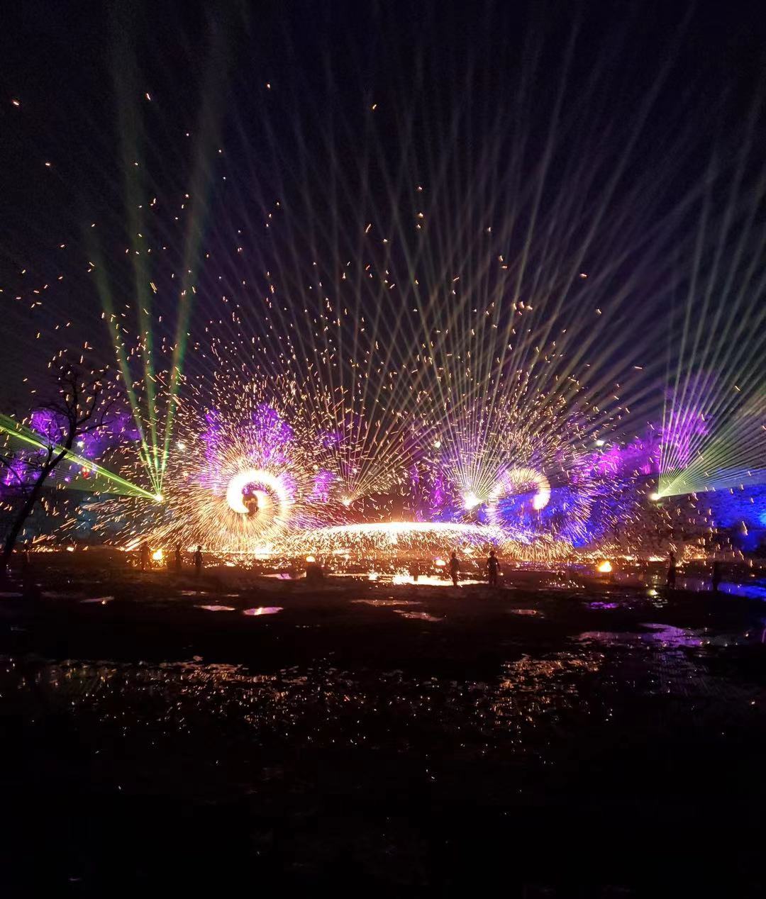 如今在開封萬歲山城寨沙場看到的打鐵花演出,在傳承古老技藝的同時融入了 舞火龍等民俗元素後的創新表演形式——「鐵花火龍」。