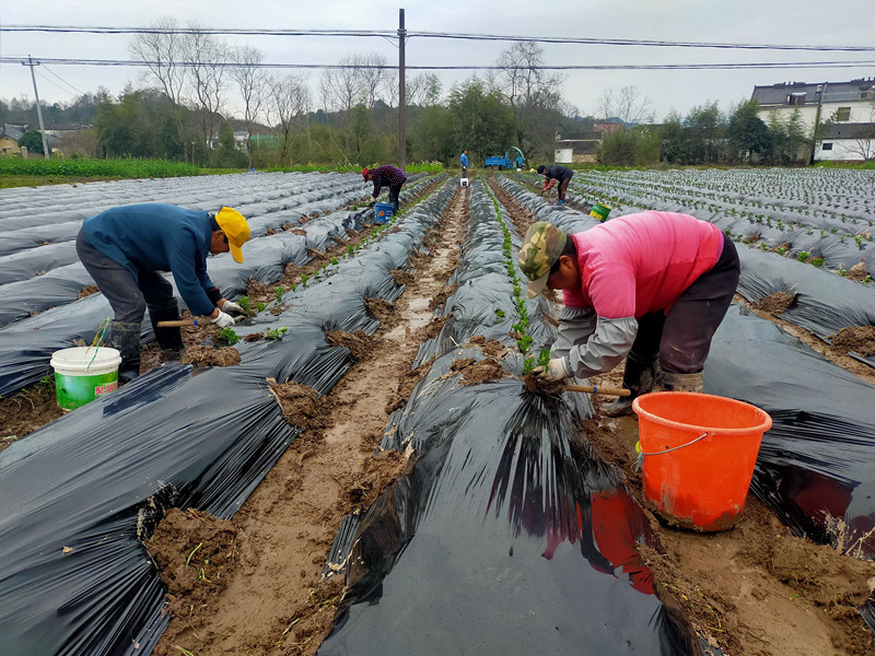 2月28日,安徽黃山市休寧縣渭橋鄉上前、渭橋、資村等村的村民不誤農時紛紛栽種菊花。