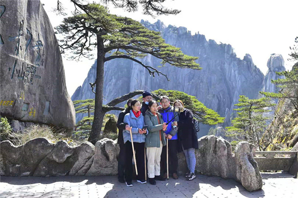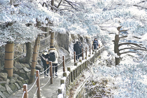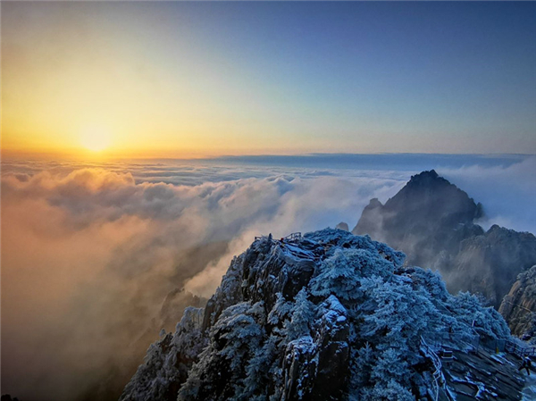 浩瀚的雲海也鋪滿青山之間,山峰從雲海中漏出山頂,配上掛滿冰花的奇松,向遊人們展現出一幅美麗水墨畫,讓人陶醉,如身在仙境一般。有的遊客攜全家一同欣賞霧凇這一奇景,他們攙扶著自家的老人,走走停停看看,和諧友愛的畫面給春雪之後的黃山增添一絲溫情。(記者 吳敏 通訊員 王磊 攝影:蔡季安 梅建 王新來 徐永傑 視頻:詹熙 )