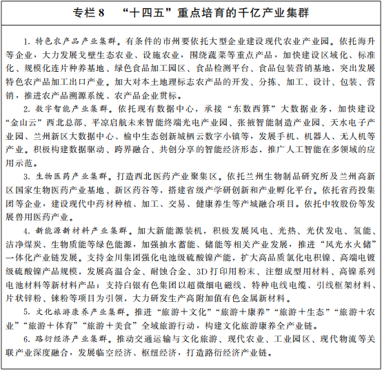 根據《綱要》,甘肅省將實施產業基礎高級化和產業鏈現代化攻堅戰,開展重點和優勢產業鏈培育攻堅行動,促進優勢產業鏈由低端向高端邁進、由短鏈向長鏈發展。集中土地、人才、資本等要素資源,綜合運用財政、金融、稅收、產業等政策,在鞏固提升石油化工、有色冶金產業集群基礎上,着力培育特色農產品、數字智能、生物醫藥、新能源新材料、文旅康養、路衍經濟等千億級產業集群。