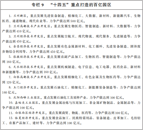 同時,依託各級開發區等重大平台和載體,全面提升園區基礎設施和服務能力,積極承接產業轉移,吸納「飛地經濟」。抓住承接產業轉移重要窗口期,建立承接產業轉移協調落實機制,完善信息對接、權益分享、稅收分成體系,千方百計承接符合產業政策、環保政策、適合我省發展的產業。充分發揮要素成本、資源和通道等優勢,集中優質要素向園區配置,引導產業項目在園區落地。加強銜接對接、定點招商、精準招商,落地一批大項目好項目,推動產業園區化、園區產業化。重點打造12個百億園區。積極培育發展潛力較大的隴西經濟開發區、武威民勤能源化工工業集中區、金塔工業集中區、定西經濟開發區、平涼工業園區、隴南經濟開發區、甘南合作生態產業園區等,成為區域產業集聚重要平台。(記者 寇剛)