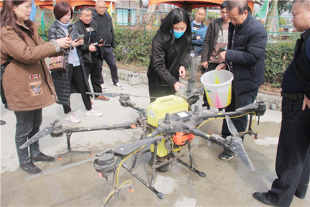 中國農業大學無人機研發團隊和四川農業科學院的專家現場演示液體花粉如何灌入無人機;