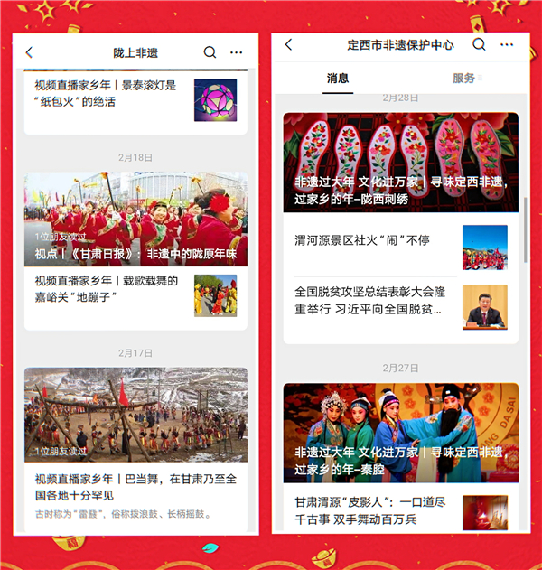 活動前期,根據文旅部文件要求,甘肅省遴選了10個非遺項目作為重點展示內容。後在各地的廣泛參與下,活動範圍擴大到全省各市(州)縣(區)的多個非遺項目。近40天的活動時間裡,蘭州太平鼓、慶陽王錄「拉板糖」、隴東(崇信)民歌、舟曲東山轉燈、文縣麻晝舞等280餘個非遺項目也加入進來,自行開展線上展示展演活動。「非遺過大年 文化進萬家」活動的開展,對甘肅省多個非遺項目進行了全方位、多層次的宣傳,讓人民群眾在疫情防控常態化背景下感受到濃濃的家的味道、年的味道,提高了甘肅省非遺項目的可見度和影響力。