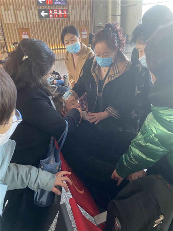 一名旅客突然意識不清,癱倒在座位上,杜麗君主任、冷菲菲主任和隨行隊員馮紹先、賈玲、馬海靜、王翠清、張艷輝見狀立即上前查看,發現該旅客為一名中年男子,全身強直、抽搐、意識不清,醫療隊員們立即對該男子展開搶救,有人先將男子的頭轉向一側,避免分泌物嘔吐物流入氣管引起嗆咳窒息,有人用隨身攜帶的筆將其口腔打開避免咬舌,有人牽住男子雙手,不停呼喚「快醒醒、快醒醒……」大家緊張而有序地進行施救。大約三四分鐘,中年男子慢慢睜開雙眼、漸漸恢復了意識,可是卻表情淡漠,不願回答醫護人員的問話。