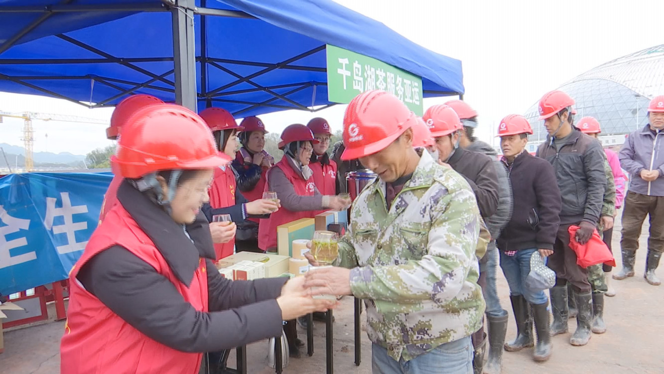 連日來,2022年亞運會浙江淳安場地自行車館施工工地,建設者們辛勤耕耘在施工現場。環保黨建巾幗聯盟成員們特地帶來兩地茶樹王剛出的新茶,並用新安江的好水泡出濃濃的好茶,把這一杯杯帶著皖浙人民春天深情問候的新茶送到亞運建設者手中。