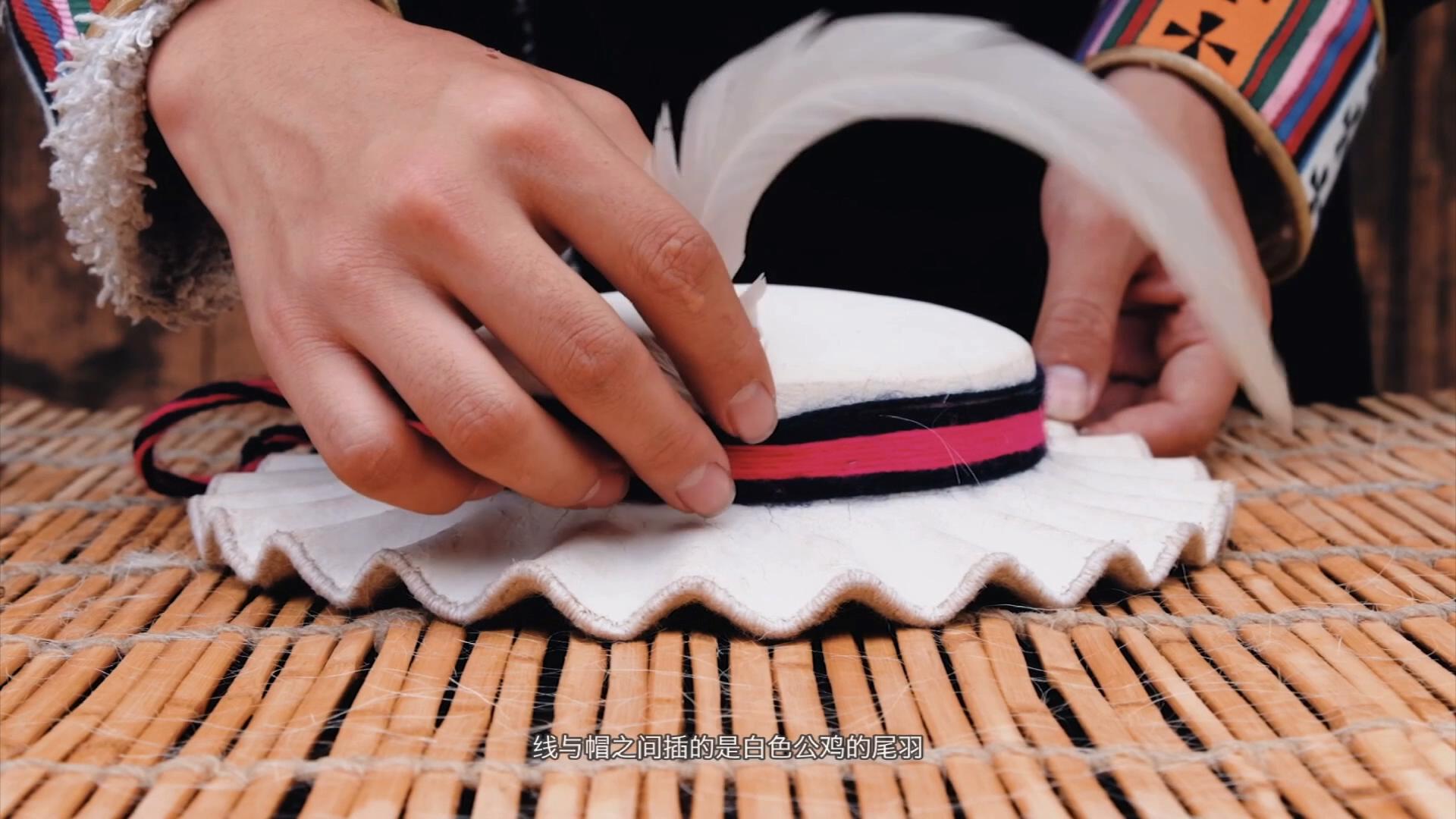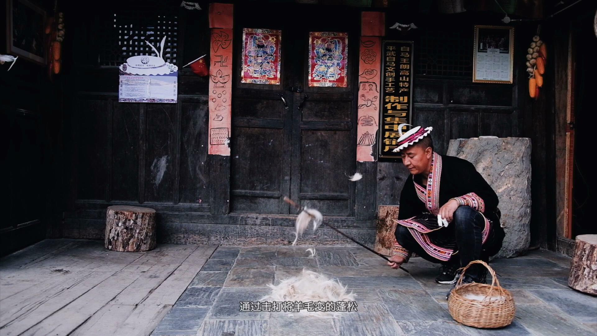 白色盤形的氈帽是山羊毛擀制的,所以羊毛,是製作氈帽的基礎。擀氈帽的第三代傳承人——楊海軍,幾乎每一周都要進入羊圈收集羊毛。盤形氈帽是白馬藏人的重要飾物之一。通過擊打將羊毛變的蓬鬆,同時抖落羊毛上的雜質。羊毛必須拿回來打,打羊毛是為了將羊毛的粗細均衡,這樣在後期擀制的時候會更加輕鬆,不打的話擀制起來非常吃力,粗細也不均勻。
