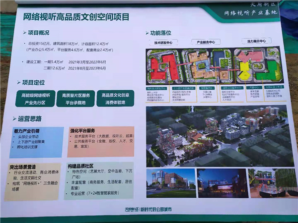網絡視聽高品質文創空間是天府新區打造的重要產業項目。該項目由成都天投集團投資建設,總投資約15億元,预计在2022年8月整體呈現。項目涵蓋文創產業公共服務平台、文化產業展演中心、文創企業創新孵化器、加速器、特色商業、生活配套服務等內容,創新搭建服務國際文創產業發展的綜合性平台,重點規劃佈局技術研發、內容創作、交易結算、營銷宣傳、數據儲存、文創金融、人才服務等,形成優質文創類企業聚集。項目通過鋼構材料等特色工業化設計,同時深度融合城市文化,打造高品質產業發展空間,塑造具有天府文化特色的網紅打卡地。
