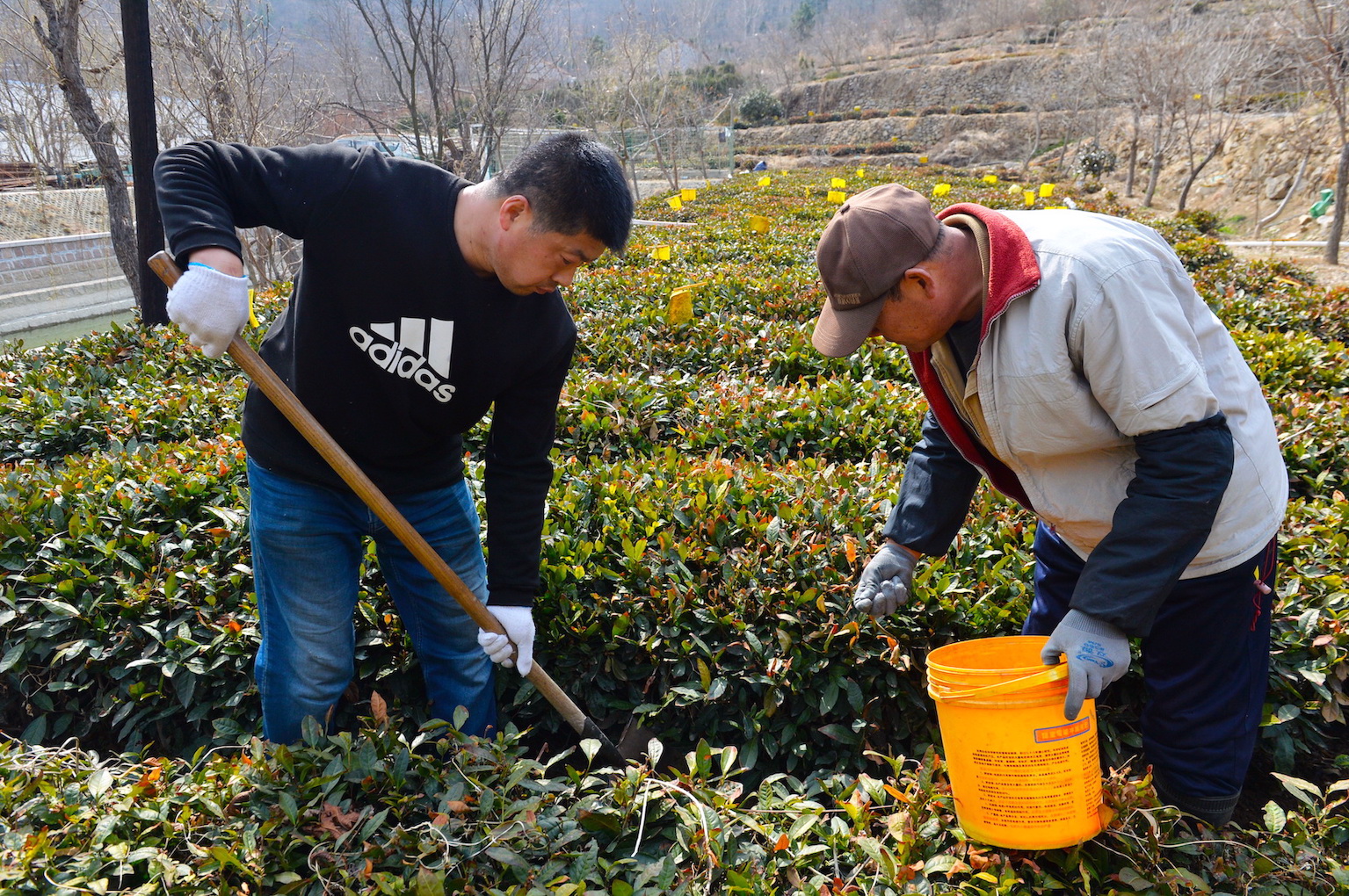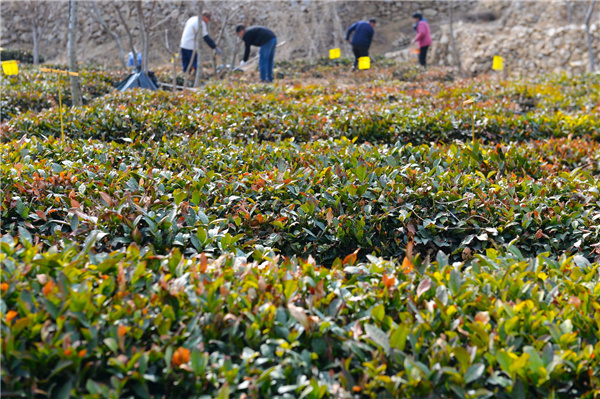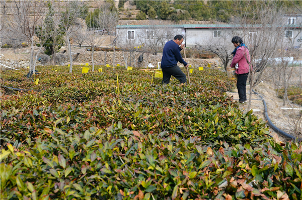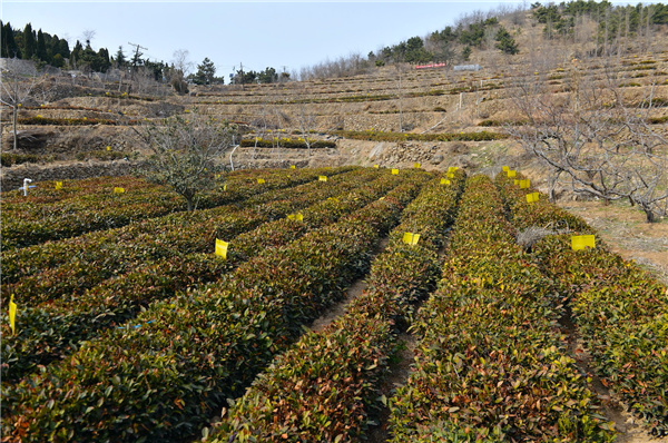 天氣轉暖,在青島市嶗山區沙子口北嶗茶園,茶農忙着追施生物複合肥,茶園呈現一派勃勃生機。茶廠負責人胡孝林介紹說,去年越冬防寒管理措施到位,雖然經歷零下18度的極寒天氣,100多畝露天茶園只有地頭部分茶樹發生凍害。預計茶園春茶產量比往年會減產一成。等到春分氣溫高於7度之後,再給茶樹剪枝促進發芽,4月20日穀雨後露天春茶可以採摘。
