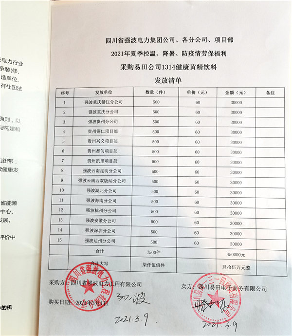 2021年3月9日,四川易田電子商務有限公司與四川省強波電力工程有限公司在慈航港灣酒店正式簽訂了關於「2021年夏季控溫、降暑、防疫請勞保福利採購易田公司1314健康黃精植物飲料共計7500件」的合作協議,用實際行動助力鄉村產業。