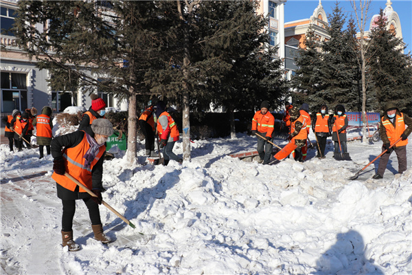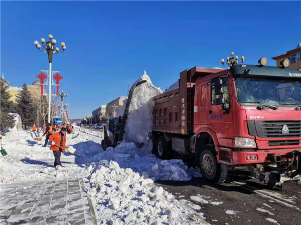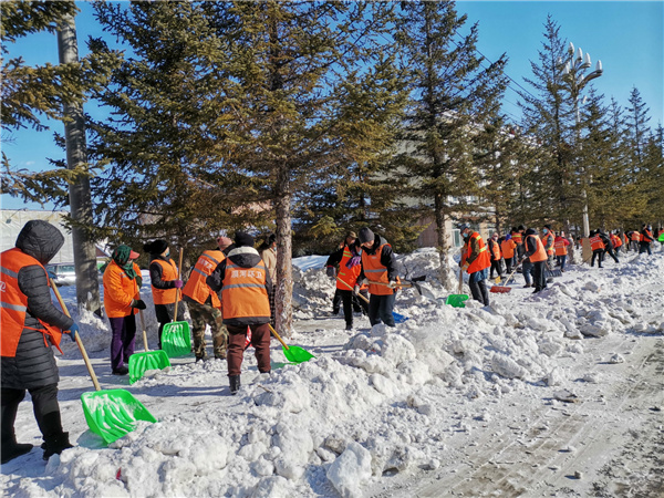 漠河市政中心將清除「越冬痕跡」活動分為「清理居民小區內的積雪,清理城區街道兩側雪牆,清除平房區殘冰殘雪」三個階段實施,投入了4個中隊160人,出動機械車輛7台,每天可調運冰雪60餘車。