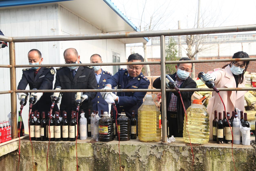 據悉,在此次銷毀的偽劣物品中,食品藥品比重最大,食品類有酒類、餅乾、麵包、調味品、保健食品、粉絲等;藥品(含醫療器械)類主要為醫用一次性口罩、隔離面罩等近3萬隻。整個銷毀活動嚴格遵循環保無污染原則,採取無害化處理方式,液體類入污水處理設備集中處理,固體類則進行分揀處理,資源化再利用,無法回收利用的進行集中銷毀。