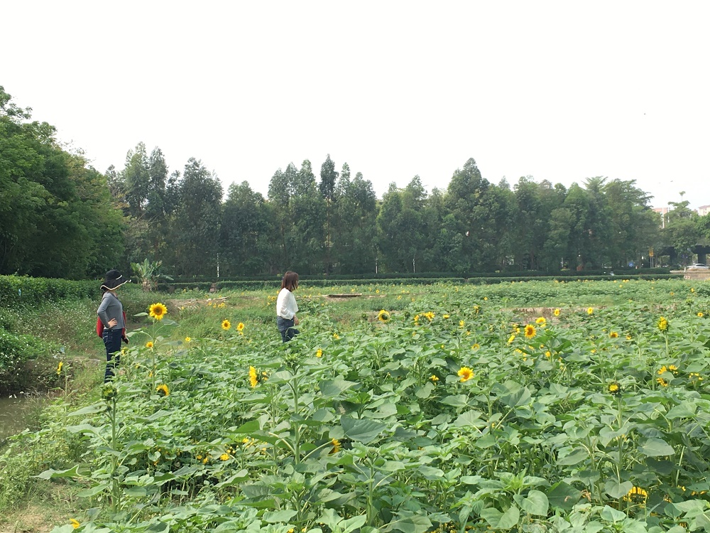 在大嶺丫村水岸楓林區,向日葵花海雖然沒有大面積開花,但是仍然阻擋不了市民踏青賞花的步伐。除了向日葵,田裏還種植了一批金絲黃菊,在太陽的照射下,金光燦爛、十分漂亮。