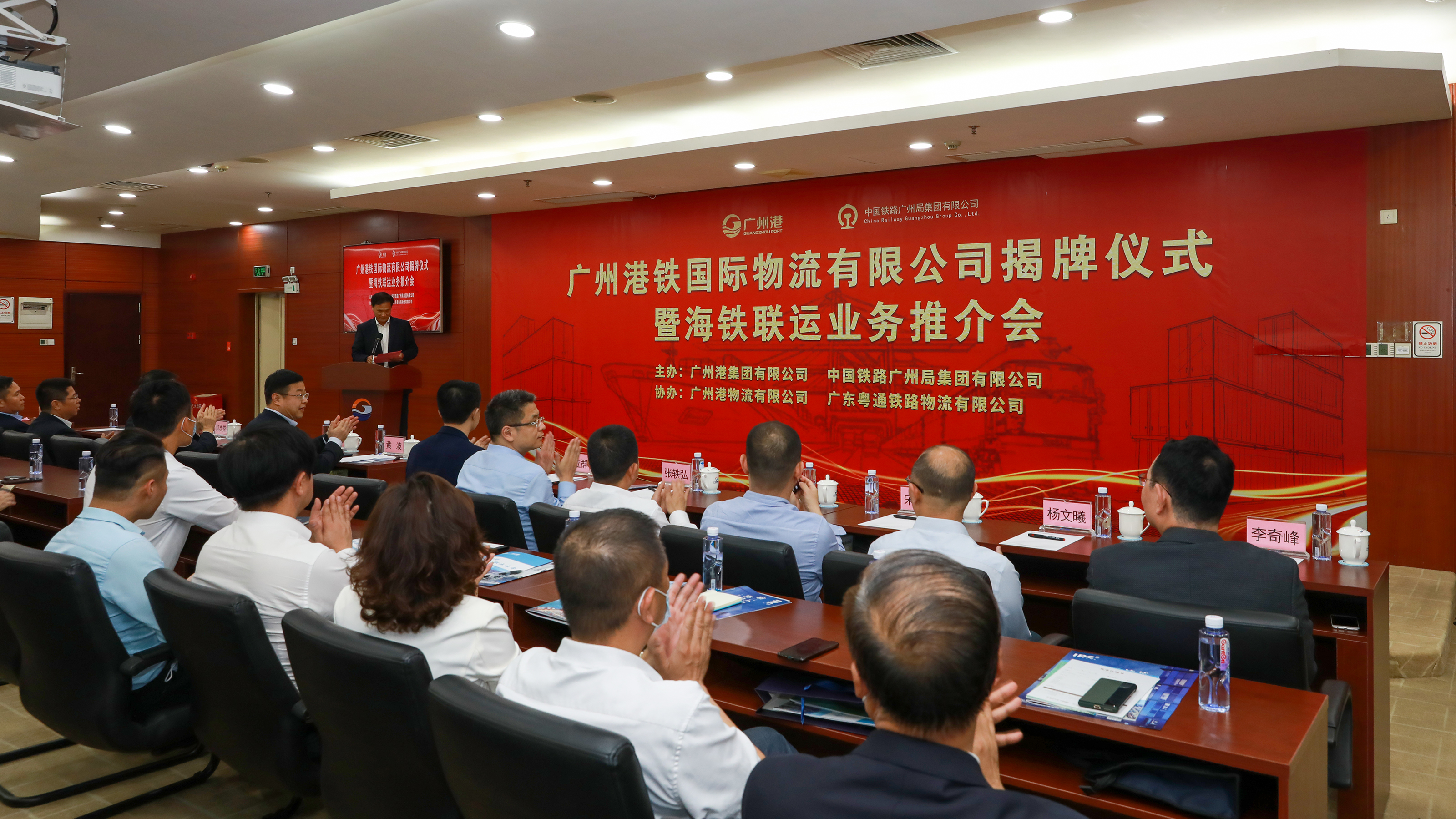 廣州港集團與中國鐵路廣州局集團近日在港口中心共同舉辦廣州港鐵國際物流有限公司揭牌儀式暨海鐵聯運業務推介會。廣州港集團總經理黃波,股份公司總經理鄧國生,中國鐵路廣州局副總經理鮑立群,廣東粵通鐵路物流有限公司董事長馮奕續等出席揭牌活動。