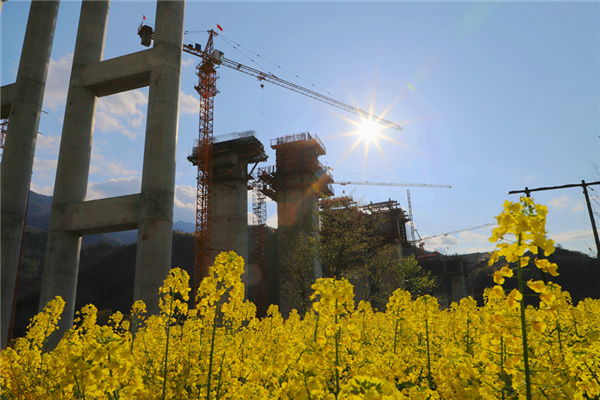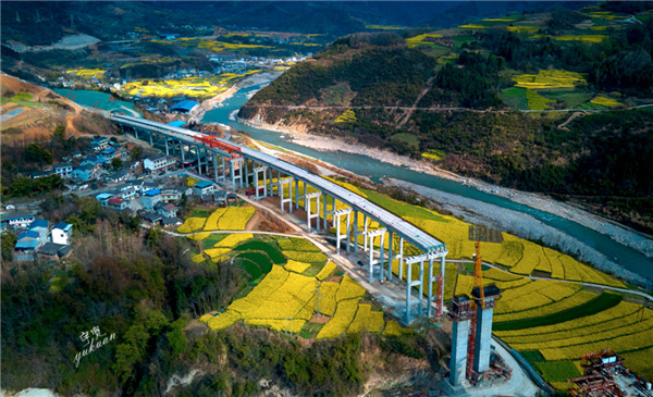 古城鎮火炬村,漫山的油菜已花開成海,遠遠望去,色彩鮮艷、層次分明。正在建設的廣平高速大坪涪江特大橋,猶如一條長龍穿行在這片菜花之上,與遠山、河流、村落交相輝映,從空中俯瞰,美如畫卷。廣平高速公路融入金色花海,春意盎然,絢爛多彩,成為鄉間一道美麗風景。菜花還是那片菜花,但今年廣平高速已初具雛形,在春暖花開之時與菜花同框,通車之日,駕車行駛在這條高速上,窗外的風景真是讓人心曠神怡。