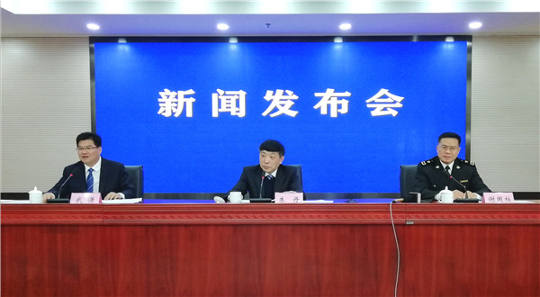 推進安徽跨境電商發展新聞發佈會現場,左起:安徽省委宣傳部新聞發佈處處長武瀟主持發佈會,省商務廳副廳長朱丹,合肥海關副關長謝國柱先後介紹相關情況,並回答記者提問(孫軍/攝)