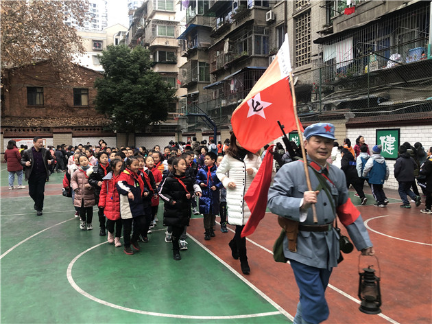 在成綿路小學躍北校區教學樓走廊里,一群學生圍着一面手抄報牆,津津有味的品讀着報中內容。「這是我們近日開展的『學黨史感黨恩學生手抄報』活動。」學校德育處主任何顯玲介紹說,每當學校的大課間時段,操場上都是人流涌動、熱浪滾滾。全校1100餘名師生在操場上「蛇形」走位,隨着一面「紅軍軍旗」的引領,踏着澎湃的韻律,進行着日復一日的大課間跑操。「『老紅軍』領着跑操,是我們這所『特殊黨費』援建學校的一大特色。」。在「全民學黨史」活動中,學校充分運用「紅色教育」資源,深入開展「革命薪火家校共傳承活動」、「雛鷹之聲紅領巾廣播站講黨史」、「黨史知識競賽」、「紅色傳承大課間」等一系列活動。