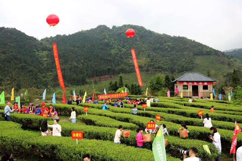 茶園裏,梅山生態茶園茶芽萌動,賓朋來到茶園與茶農們一起采「首芽」,當採摘下來最新、最嫩的春茶裝進茶簍里時,茶農們滿面笑容,喜上眉梢。邵阿姨告訴筆者,我們這裏環境好,無污染,水源充沛、光照充足,常年雲霧繚繞,產出的茶葉微量元素豐富,口感好!早茶品質好,價格高,銷路好,我家種有100畝茶園,在我精心打理下,每年可收入80多萬元,比種植傳統農作物強多了,歡迎大家前來品嘗春茶!