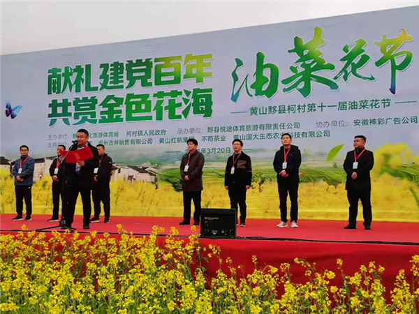 “舉辦以‘獻禮建黨百年、暢遊金色花海’為主題的第十一屆安徽黃山黟縣柯村油菜花節活動,旨在讓我們鑒賞這金黃色的油菜花海與黑牆白瓦的徽派村莊交相輝映所勾勒出的美麗畫卷,感悟革命前輩艱苦奮鬥的紅色歲月,品嘗土生土長的特色美食。”柯村鎮鎮長汪琦在致辭中說,借助油菜花節的舉辦,向我們偉大的黨獻禮,為我們偉大的黨唱響讚歌。