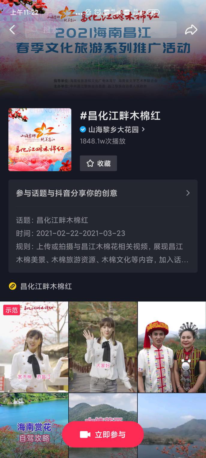 與此同時,線上開展的“雲賞木棉紅”活動中,特設“昌化江畔木棉紅”抖音話題,截至目前話題播放量已超1848萬次。目前,線上“雲賞木棉紅”活動仍在火熱開展中,持續推出的“木棉花開幸福來”“木棉花開愛情來”等多條主題短視頻,引發了數萬網友點贊轉發。“唱黎歌·學黎語·黎鄉情話唱出來”和“15秒快嘴玩轉昌江十大景區景點”兩大挑戰更是吸引了數千人參與,共贏昌江旅遊基金大獎。此外,已上線的“木棉花開愛情來”H5小遊戲,以極具互動性和趣味性的特點,吸引過萬網友參與分享,實現150萬次曝光。