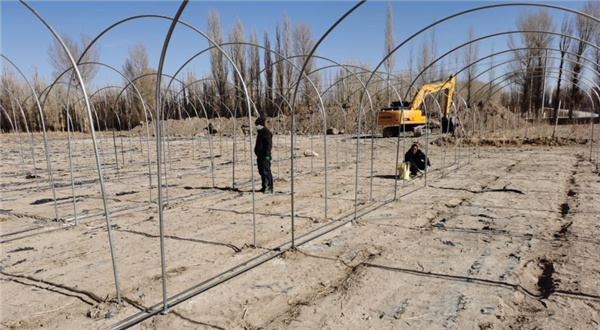 「三春」時節,走進甘肅省瓜州縣西湖鎮中溝村優質蜜瓜產業示範園區,人們正在架設鋼架大棚,一片繁忙景象。
