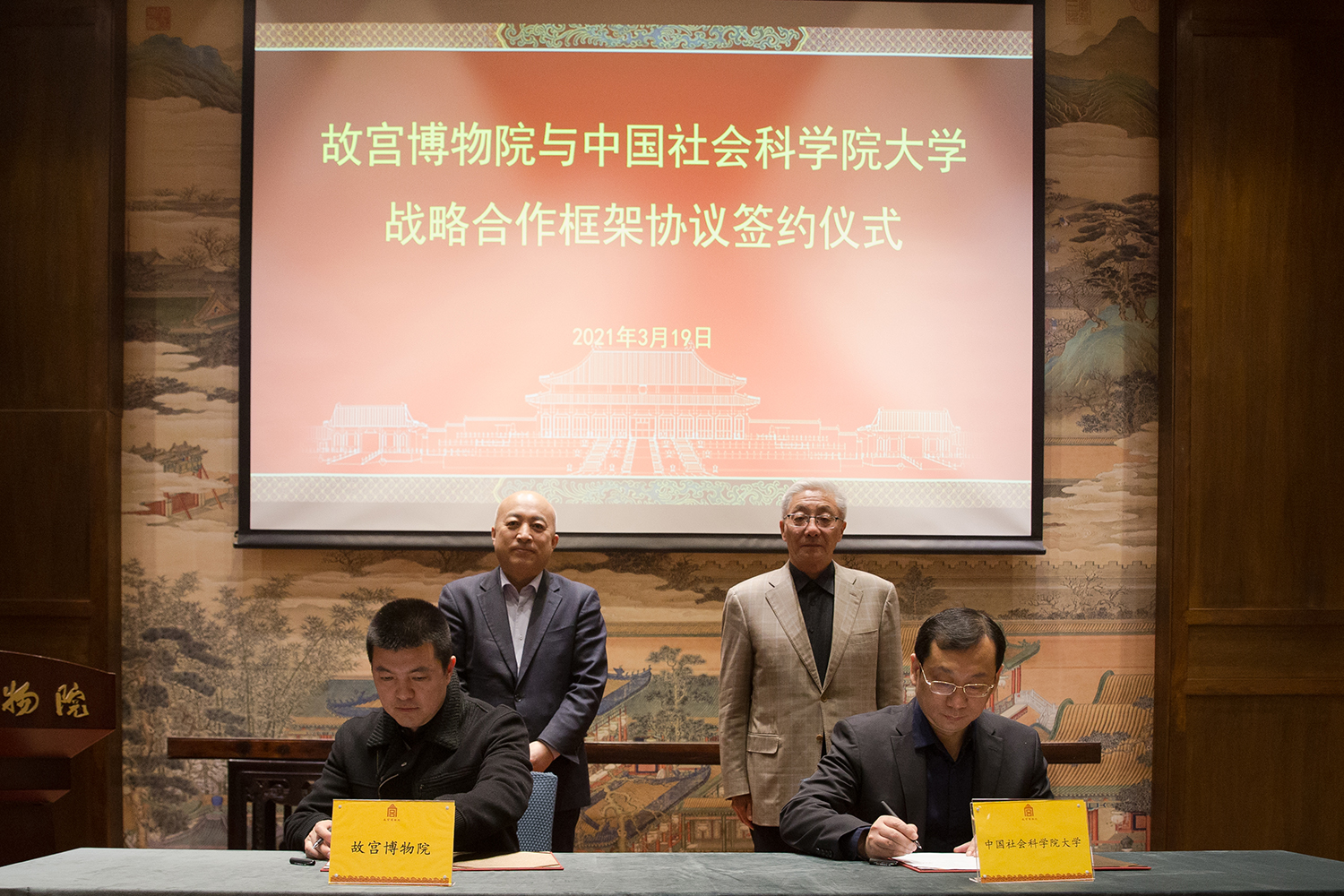 2021年3月19日,故宮博物院與中國社會科學院大學在故宮博物院建福宮花園敬勝齋續簽戰略合作框架協議。雙方承諾未來在平等互利、優勢互補的基礎上,開展人才培養、科學研究、學術交流等合作。