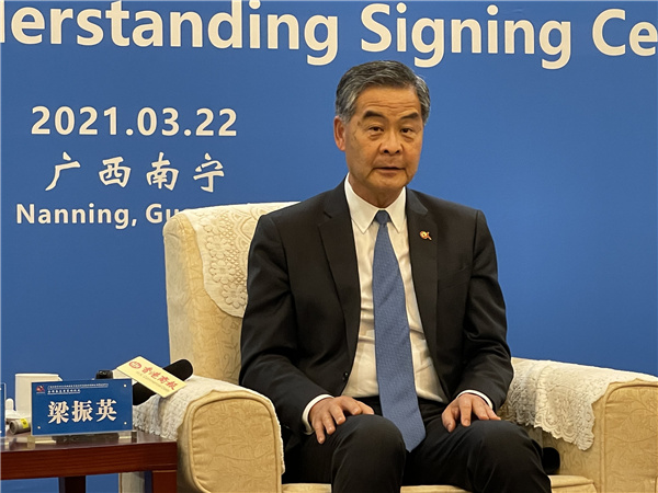 香港發揮發揮優勢擔當國家責任,梁振英表示,積極主動融入國家大局,是香港作為國家一部分的應有之義,如「愛國者治港」是天經地義。另外,梁振英透露,本次簽署的合作項目最快6月可以啟動。