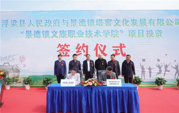 3月23日,江西省浮梁縣與景德鎮塔窖文化發展有限公司合作建設的景德鎮文旅職業技術學院正式落戶浮梁縣壽安鎮。著名文化經濟學者、國家文旅部特聘專家、景德鎮軟實力研究院院長彭中天,景德鎮塔窖文化發展有限公司董事長徐錦彬出席簽約儀式並分別致辭。北京大學博士、歷史文化教育專家、教授習罡華,南開大學博士、教育學碩導、教授蘇永明,陶瓷文化專家、景德鎮市政府文化顧問、景德鎮軟實力研究院執行院長王志剛;浮梁縣委書記胡春平,縣委副書記、縣長程新宇,縣政協主席陳國清,縣委常委、縣委宣傳部部長鄭偉秀等出席儀式。縣委常委、市高嶺瑤裏風景名勝區管委會主任張金水主持儀式。