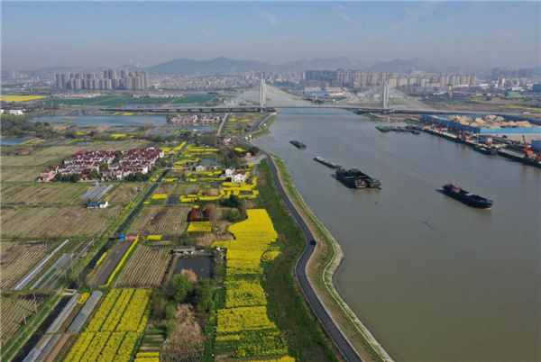 當日上午,我們來到貫通後的裕溪河右岸防汛通道上,蜿蜒的道路已經鋪上嶄新的柏油,道路平坦而開闊,與已建成的巢湖大橋、裕溪河大橋遙相呼應。行走在路上,清澈的裕溪河水波光粼粼,盛開的油菜花點綴岸邊,合裕航道上來往的船隻穿梭不息。從空中俯瞰,油菜花金光燦爛,小麥地碧綠如玉,良田阡陌,美景如畫。