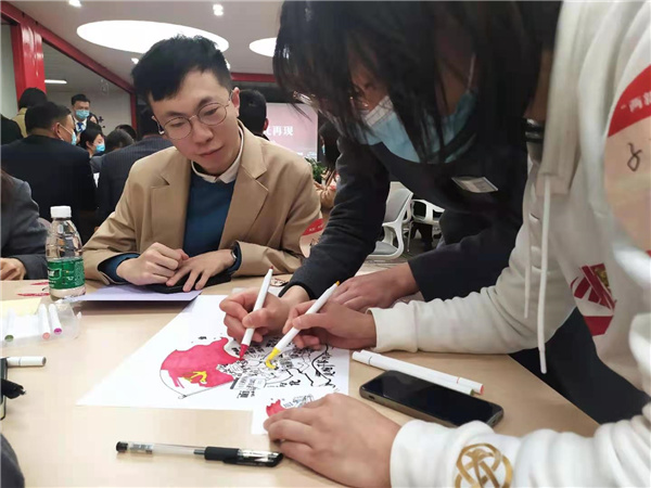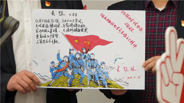 在「榮光再現」現場創作環節中,與會黨員分組作畫、創作詩詞,集思廣益,盡情發揮,現場手工製作作品表達對黨100年華誕的祝賀之情。一幅飄揚在山頭的黨旗,前面站着威武勇敢的紅軍戰士的畫作,贏得現場黨員幹部陣陣掌聲,生動再現了不畏艱難、不怕困苦的長征精神,以及不怕流血犧牲的革命英雄主義精神。
