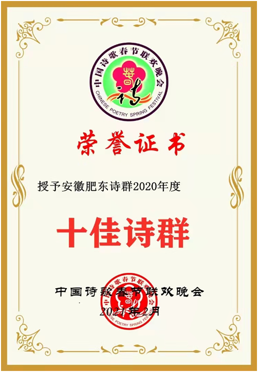 近日,安徽肥東詩群收到第七屆中國詩歌春晚寄來的全國「十佳詩群」榮譽證書,這為百花齊放、百家爭鳴的肥東文化事業錦上添花。