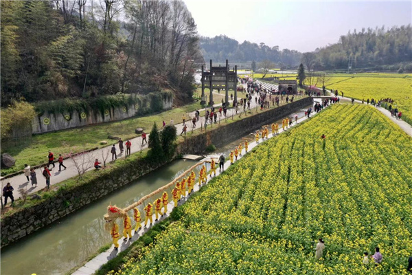 花海引流聚氣。在潛口鎮蜀源村,村民們身著統一服飾,揮舞著親手紮制的草龍,在花海裏起舞,遊人們紛紛拿起相機、手機鏡頭追逐勝景,盡情享受如詩如畫的田園風光。在岩寺鎮紅光村,一場“踏春親子遊 童趣蘊虹光”活動正在精彩上演。花海裏,孩子們騎著滑步車奔跑;父母帶著孩子滾鐵環、打紙鱉、跳房子,尋找童真童趣。