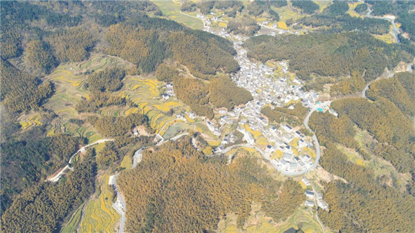 春暖花開時節,呈坎鎮靈山村千畝梯田油菜花花開正豔。空中俯瞰,梯田、村莊、藍天和白雲相映成趣,繪就了一幅生動的江南田園最美畫卷,吸引眾多遊客駐足觀賞。