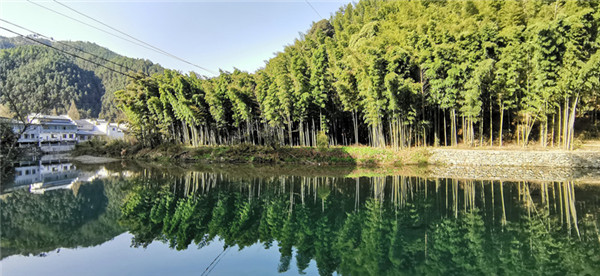 3月27日,春雨過後的新安源頭晴空萬里,安徽省休寧縣鶴城鄉大源河河水清澈如鏡,景色一新。蔚藍的天空,青翠的竹林、樹木和白牆黛瓦的民房,倒映在水面上,水天水色,如詩如畫。