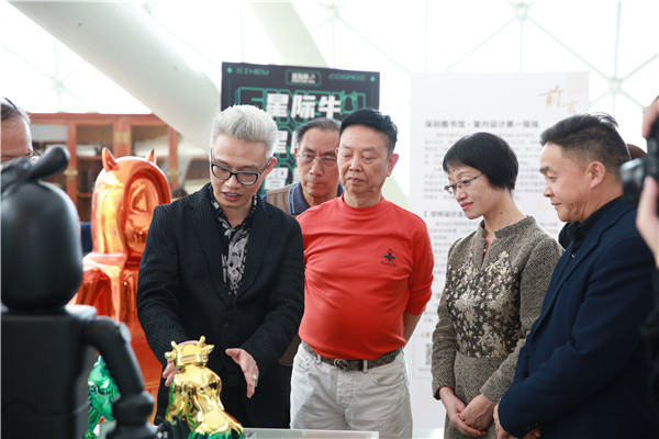 隨後,協會成員和設計師向深圳圖書館捐贈文獻。本次捐贈的文獻有《第七屆艾特獎獲獎作品年鑒》、《359°影像洪忠軒設計元素環球之旅》、《YuQiang & Partners室內設計專著》、《朗聯室內設計專著》等著作共5種,以及「星際牛」等實物兩件。