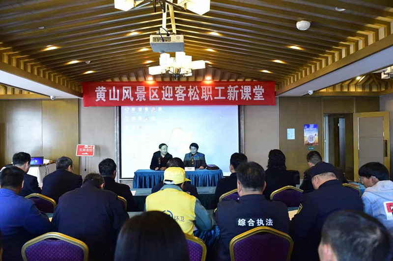 就在同一天,“迎客松職工新課堂”啟動儀式在黃山風景區玉屏景區舉行,景區黨工委副書記、紀工委書記徐金武出席啟動儀式並致辭。活動由黃山風景區管委會政治處、迎客松黨委共同主辦,黃山風景區管委會綜合執法局、黃山風景區管委會工會共同承辦,迎客松黨委、管委會綜治局、管委會工會相關負責同志及玉屏片區一線職工、先模人物等40餘人參加啟動儀式。“迎客松職工新課堂”通過請專家講學,下基層送學,更好滿足一線黨員和幹部職工學習需求。