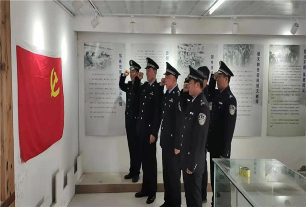 「我志願加入中國共產黨員,擁護黨的綱領,遵守黨的章程,履行黨員義務……」富裕縣公安局紹文派出所全體黨員重溫入黨誓詞的聲響在烈士故居內久久環繞。