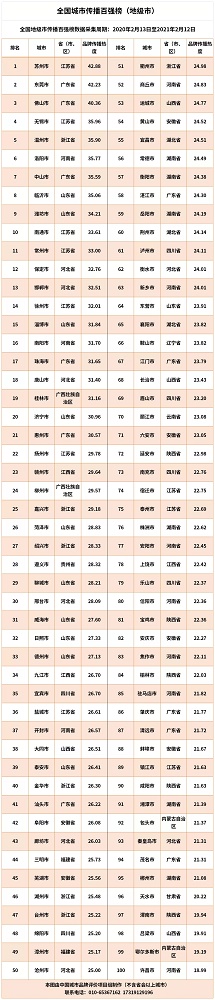 近日,2021全國城市傳播熱度排名發佈會在人民日報社舉辦。中國城市品牌評價項目組、人民日報《中國城市報》社聯合清華大學國家形象傳播研究中心,根據國家統計局和微熱點大數據研究院數據及相關標準,對全國261座地級市(不含省會以上城市)、393座縣級市最近一年(2020年2月13日至2021年2月12日)有關數據進行標準化計算,分別發佈地級市和縣級市傳播熱度指數排名前100名單。在地級市百強榜單中,江蘇省蘇州市排名首位,廣東省東莞市及佛山市分列第二、第三。