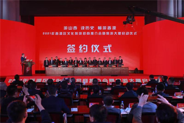 推介會上,特色景區太山、太原植物園;特色街區晉陽里、晉陽集市、阿里雲;中國傳統古村落店頭、程家峪、赤橋;美麗鄉村趙家山、花塔、窯頭、杜里坪等項目分別進行精彩推介。山西省旅遊協會、華旅信用、陽光財險、山西國潮夜市、平遙古城、皇城相府景區、喬家大院、山西攜程等省內知名上下游企業和入駐旅遊大廈的旅遊機構代表分別同晉源區政府簽約。同時,晉源區政府與萬國中央公園、復星晉陽湖旅遊蜂巢、保利?汾河嶼湖等新興產業大項目進行招商簽約。簽約總金額近500億元。