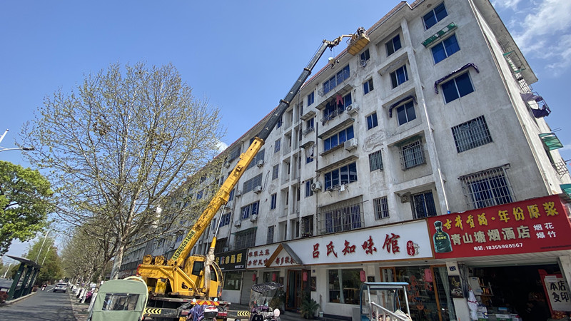 3月29日上午,在屯溪區陽湖鎮柏山社區青山塘社區門口的一臺大型吊車上,工人們站在高20米的作業臺上,對樓頂風化的磚瓦進行清理。據瞭解,青山塘社區建成至今已有20多年的時間,屬於老舊社區,社區樓頂部分瓦磚、牆面水管脫落情況嚴重,同時還存在外牆滲水等問題,給居民帶來不小的困擾。這次,社區進行了集中維修,讓居住在這裏的居民連連稱好。