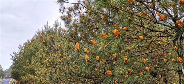 仲春時節,在皖南休寧境內的省道漁瑤公路右龍嶺沿途,松樹周身散發出光亮的新綠,沐浴著春風和暖陽,它們開始競相開花。