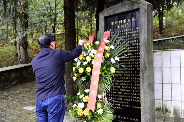 在黃山東麓譚家橋,中國無產階級革命家、軍事家粟裕將軍墓前,景區黨工委班子一行敬獻花籃,大家獻上鮮花,緬懷革命烈士,寄託心中哀思。