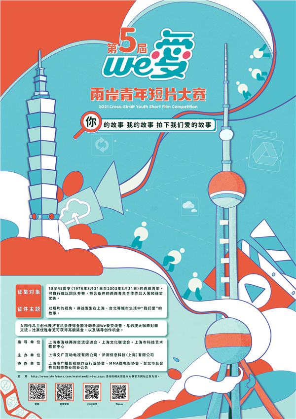 據悉,We愛·第五屆兩岸青年短片大賽,由上海市海峽兩岸交流促進會、上海文化聯誼會、上海市科技藝術教育中心指導,上海文廣互動電視有限公司、滬測信息科技(上海)有限公司主辦,上海市廣播影視製作業行業協會、MMA微電影協會、台北市影音節目製作商業同業公會協辦,延續以「我們愛」為主題,面向兩岸青年徵集10分鐘以內的短片作品,鼓勵呈現發生在上海、台北等共同生活的兩岸之間關於愛的故事。