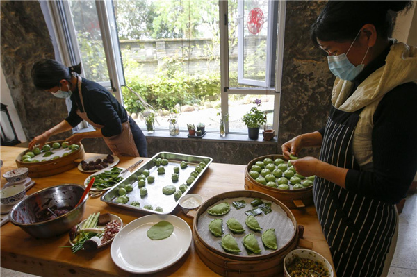 4月1日,走進徽州區西溪南古村落的特色民宿,美食手藝人張建玲正和當地村民一起製作“清明餃”和“青團”。野外採摘來的新鮮艾蒿榨出汁液,倒入新鮮的糯米粉和秈米粉中攪拌,然後擀成薄皮,再填入時令筍丁、香菇丁和徽州火腿肉、豆腐乾等原料做成的餡料,邊緣掐攏,捏合成月牙形的“清明餃”。或揉團填入軟糯甜口的豆沙,再揉搓成一個個圓潤的球型“青團”,把春天的一抹青綠化作流連唇齒間的獨特“春味”。