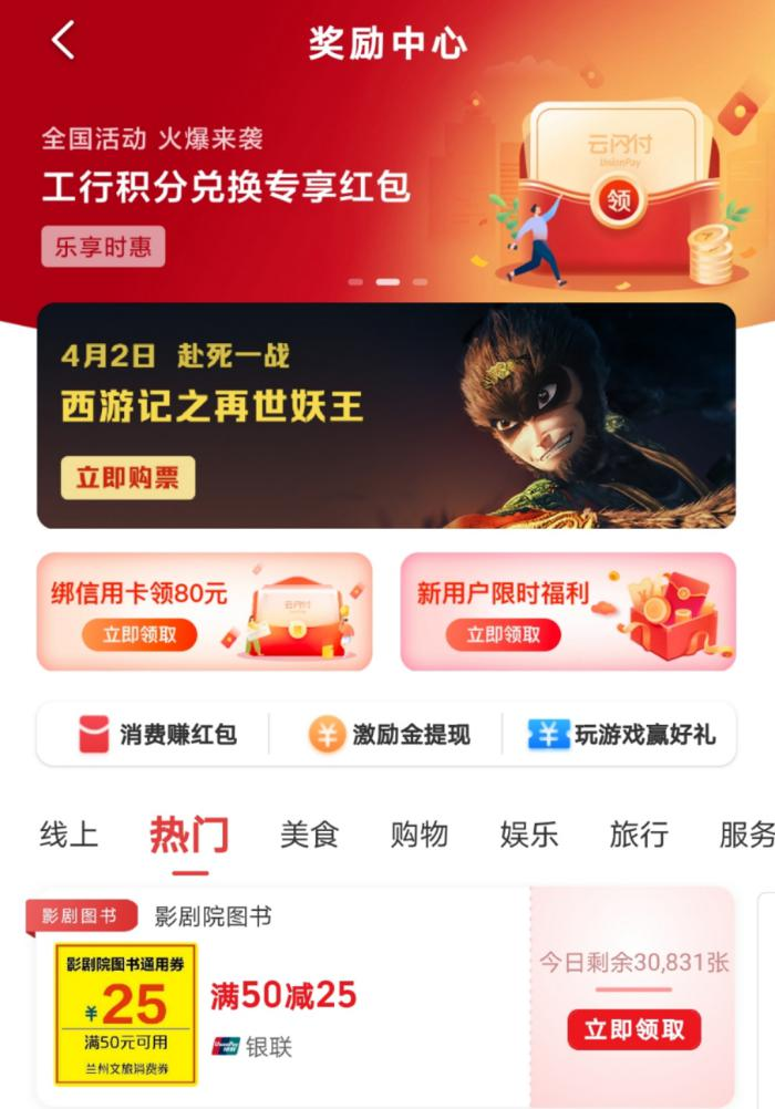 消費券可參與多種消費方式,其中,通過券購買電影票的用戶,在雲閃付APP首頁「本地專區」-「惠民觀影」中選擇適當的院線及影城選擇62開頭銀聯卡直接支付,當支付金額大於50元即可直接抵扣;通過券購買圖書或劇院門票的用戶,到店消費結賬時,請先告知收銀員使用雲閃付APP優惠券,選擇62開頭銀聯卡出示雲閃付APP生成的「付款碼」,收銀員掃碼完成支付;或打開雲閃付APP的「掃一掃」,掃描商戶門店「收款碼」完成支付。(記者 寇剛)