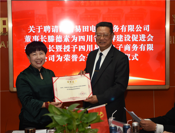 4月2日,作為2008年中國創建最早的農村電商——四川易田電子商務有限公司被四川省品牌建設促進會授予榮譽會長單位,四川省工商聯常委、該公司董事長滕德素被聘為榮譽會長,同時,四川省品牌建設促進會又與該公司簽訂了戰略合作協議並舉行了隆重的頒證和授牌儀式。