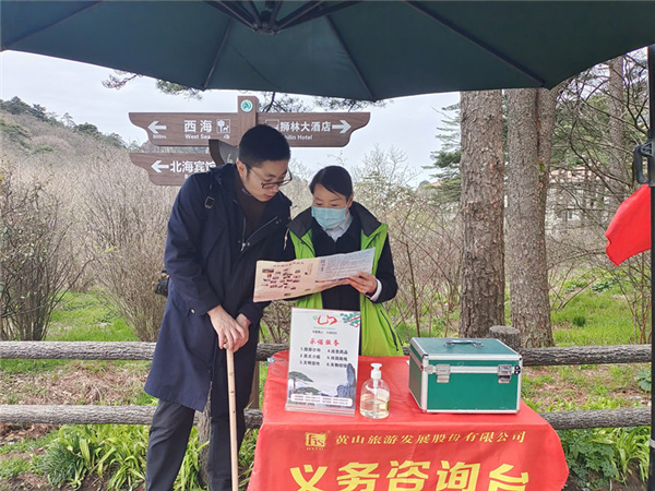 清明假期,景區各單位廣泛開展迎客松黨群志願服務活動,在主要遊客集散地點設置服務台,為遊客提供路線指引、景點介紹、行李寄存、常用藥品、免費熱水等暖心服務。