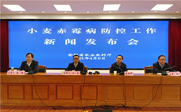 小麥赤霉病防控工作新聞發佈會現場,左起:安徽省農業農村廳種植業局局長張韙主持發佈會,省農業農村廳黨組成員、副廳長王紅,安徽農業大學副校長、省小麥赤霉病防控技術專家組組長操海群教授,省農業農村廳植保總站站長袁松先後介紹相關情況,並回答記者提問(孫軍/攝)