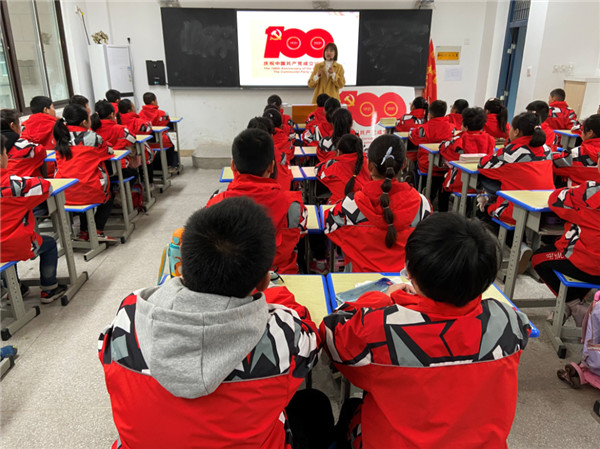 張老師結合孩子們的回答適時介紹,「這是中國共產黨成立100周年慶祝活動標識,由黨徽、數字『100』『1921』『2021』和56根光芒線組成,生動展現中國共產黨團結帶領中國人民不忘初心、牢記使命、艱苦奮鬥的百年光輝歷程……」