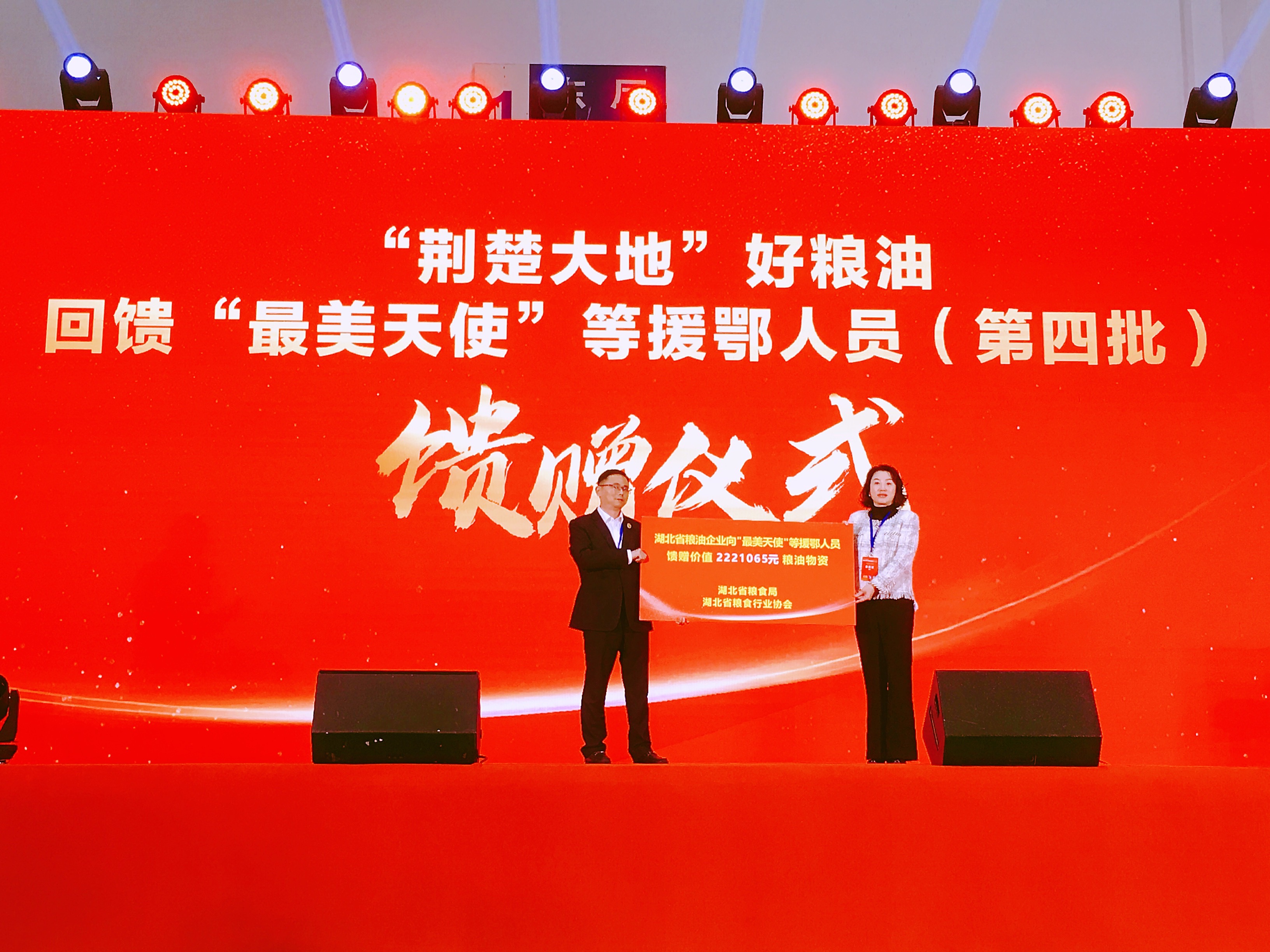 4月8日,「荊楚大地」好糧油、回饋「最美天使」援鄂人員第四批饋贈儀式在武漢國博中心舉行。